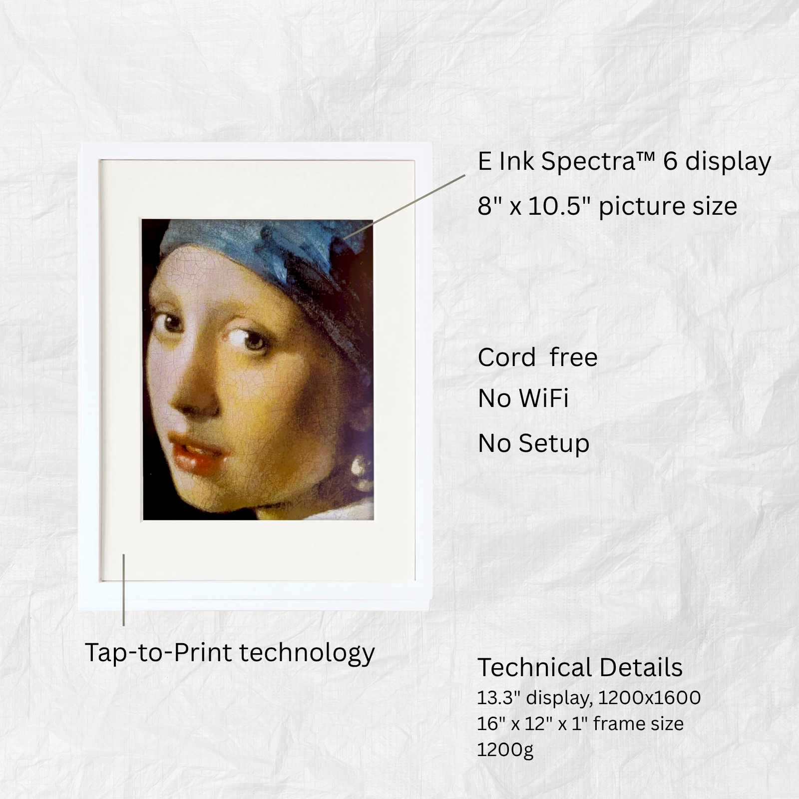 Reflection Frame uses an E Ink Spectra 6 display. This advanced display looks like printed ink on paper is extremely low power and emits no light.