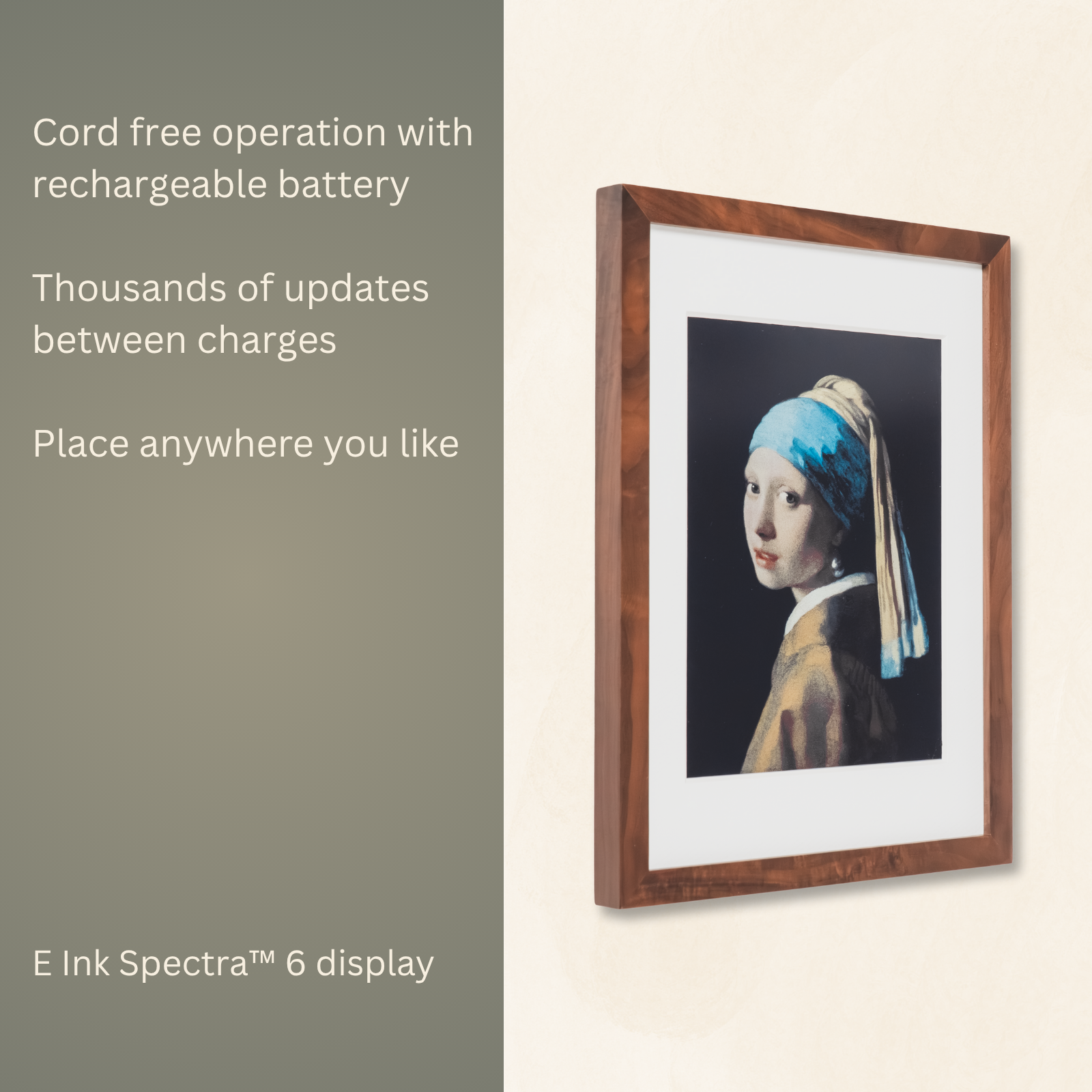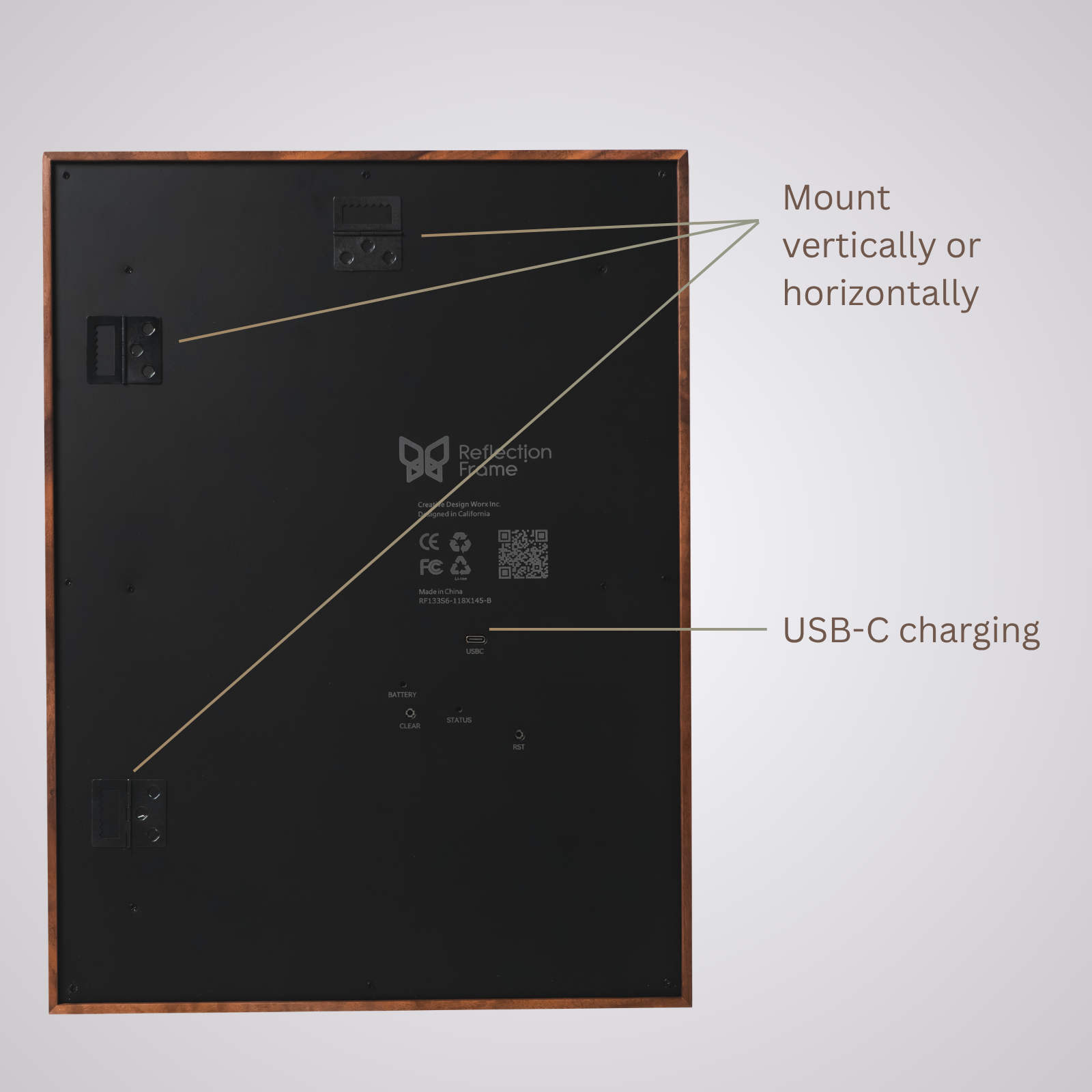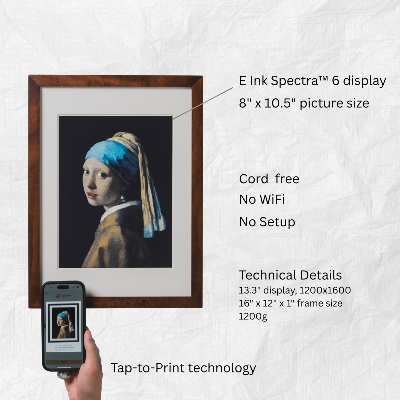 Reflection Frame uses an E Ink Spectra 6 display. This advanced display looks like printed ink on paper is extremely low power and emits no light.